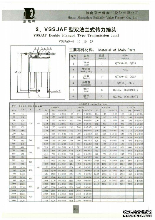傳力接頭具體分類:按外形分為:VSSJAFG(CF)型單法蘭傳力接頭,VSSJAFG(CF)型單法蘭松套傳力接頭,VSSJAF(C2F)型雙法蘭傳力接頭,VSSJAF(C2F)型雙法蘭松套傳力接頭, VSSJAGC(CC2F)型可拆式雙法蘭松套傳力接頭。按型號分為:雙法蘭傳力接頭的型號有VSSJAF型、VSSJAFC型、VSSJA-2型、C2F型、VSSJAFG 型等等。